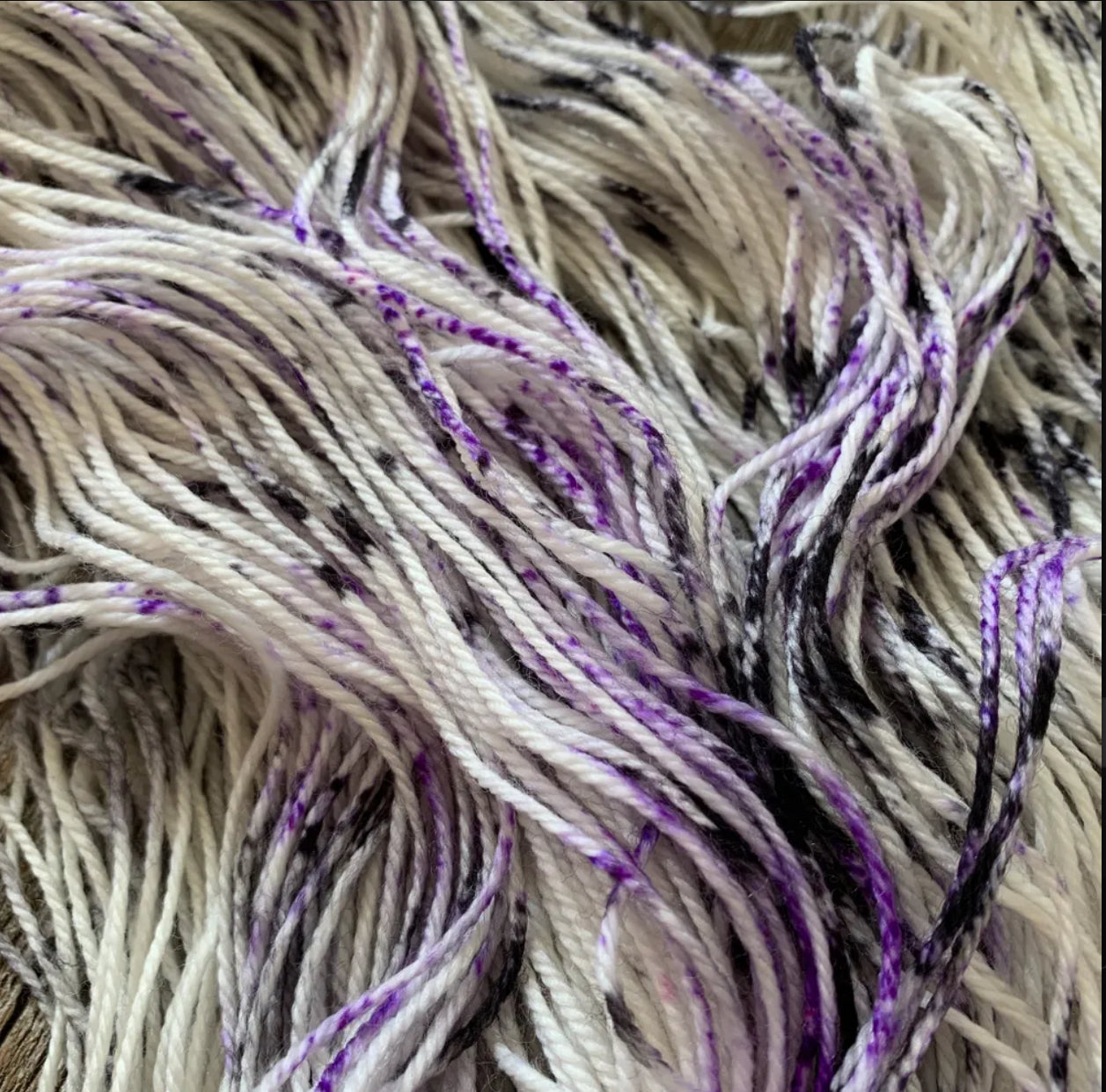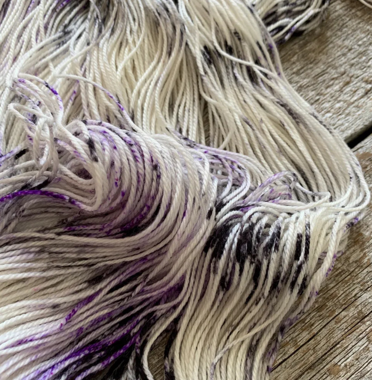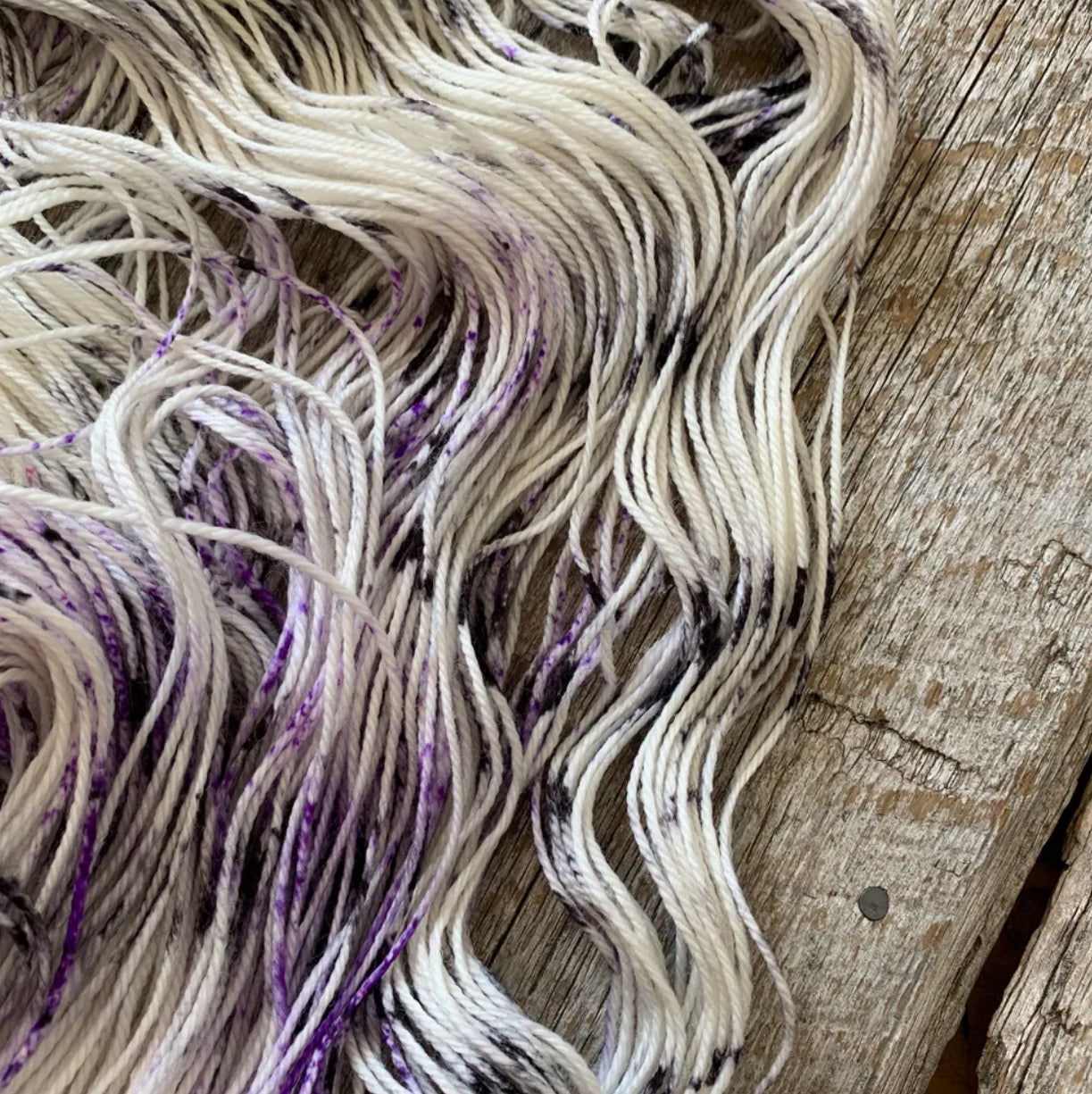 Parfait mélange entre un écheveau classique et 'flyé' , ce speckle noir et mauve sur une base naturelle saura 'puncher' vos projets :)